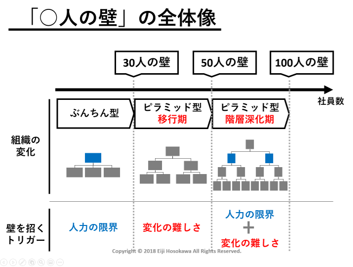 一般的に50名の壁と言われる組織問題があり、50名を超えると管理・指揮するのが難しくなること指しています。